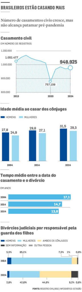 Os casamentos estão durando cada vez menos no Brasil, como revelam os novos números da pesquisa Estatísticas do Registro Civil, do Instituto Brasileiro de Geografia e Estatística (IBGE), divulgados na manhã desta quarta-feira, 10.